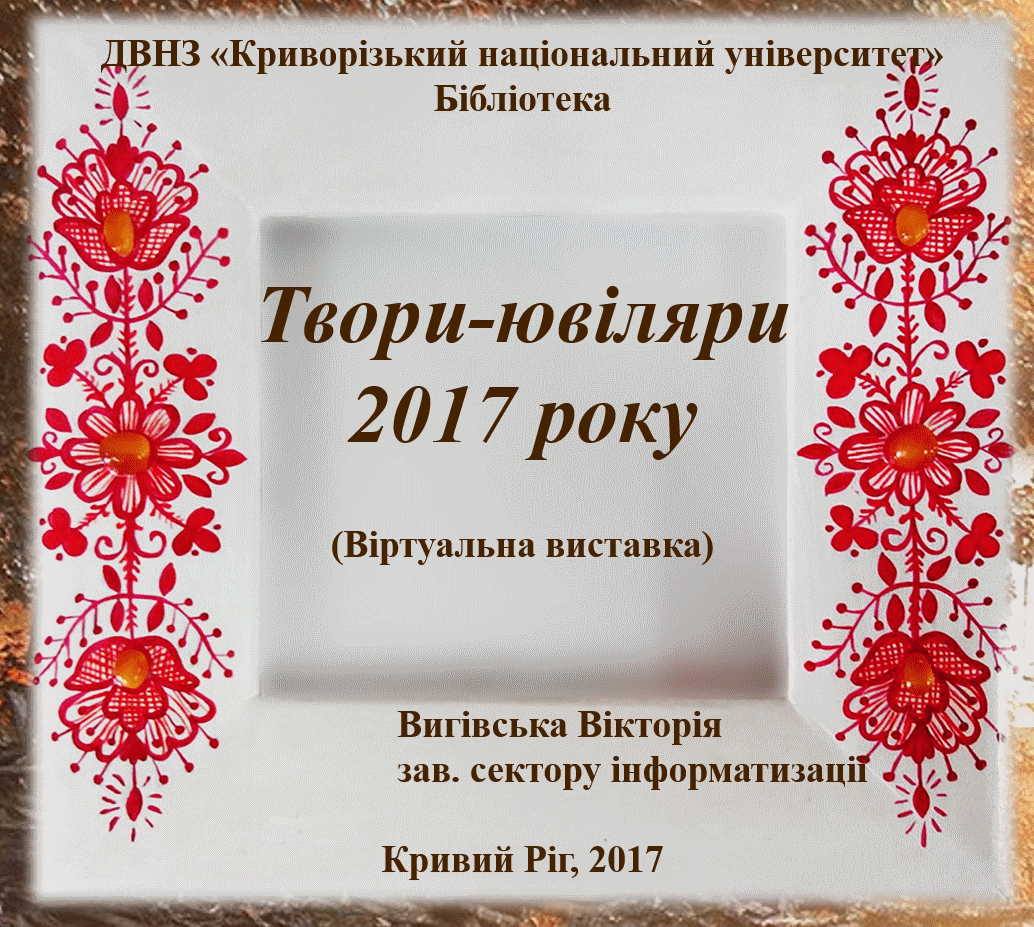 До Вашої уваги бібліотека презентує віртуальну виставку «Твори-ювіляри 2017 року». Експозиція розкриває багатство фондів художньої літератури бібліотеки, дозволяє ознайомитись з творами українських письменників, які варто знати, читати, розуміти.