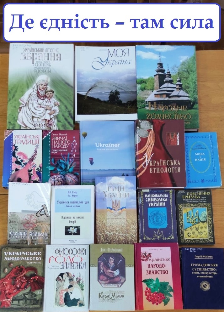 Пропонуємо до вашої уваги тематичну книжкову виставку «Де єдність – там сила». Представлена література про звичаї та традиції українців, національну символіку, національний одяг, спільну землю та історію, рідну мову, культурно-духовну спадщину. Відповідальна Людмила Баранова.