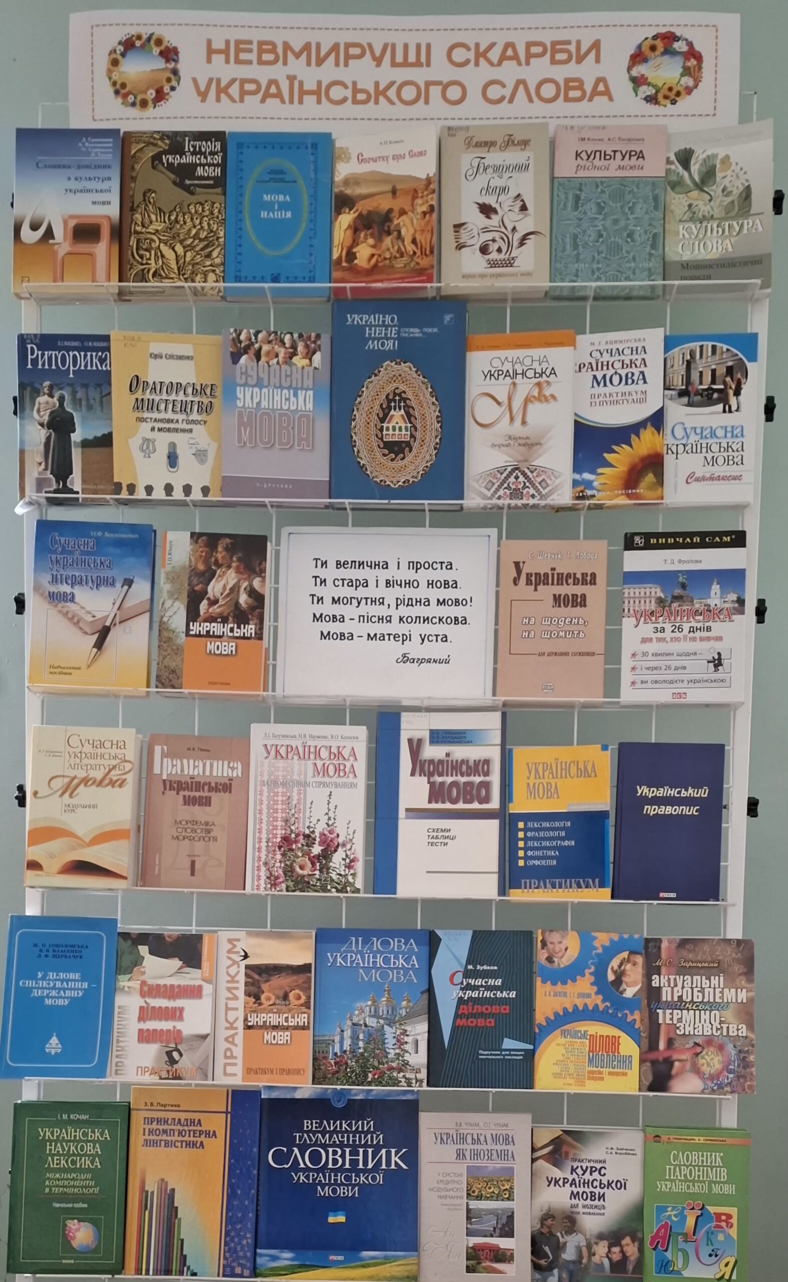 До вашої уваги тематична книжкова виставка “Невмирущі скарби українського слова“. Читачі бібліотеки мають змогу переглянути представлену літературу та відкрити для себе барвистий, співучий, мелодійний та багатий світ духовного скарбу нації – українську мову.