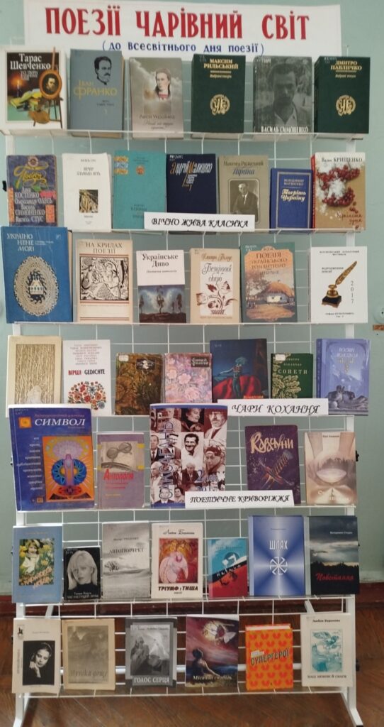 До свята в бібліотеці підготовлено тематичну книжкову виставку «Поезії чарівний світ». В експозиції представлені збірки відомих українських авторів, зокрема й творчі доробки поетів Криворіжжя. Відповідальна Ганна Юсупова.